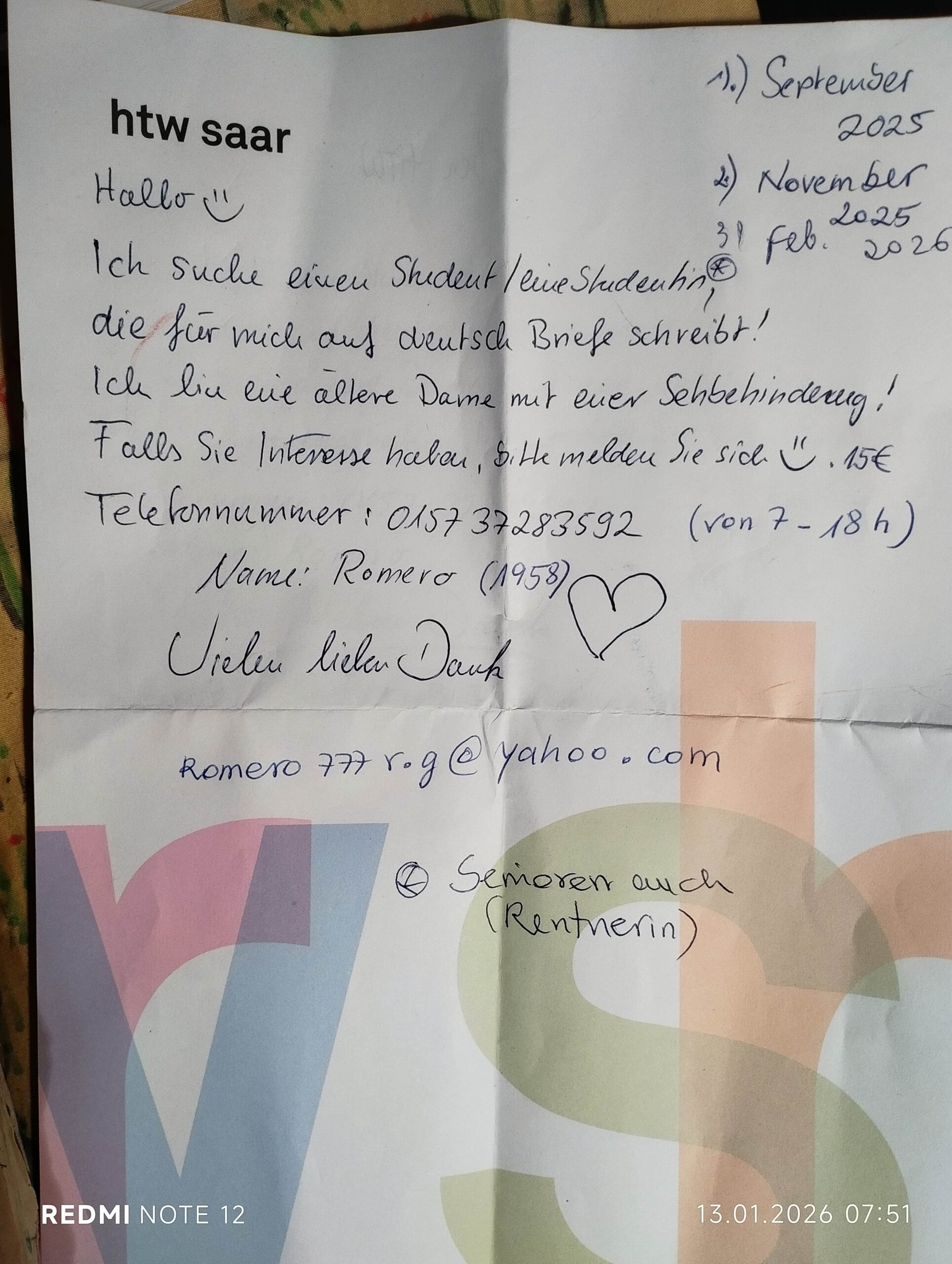 Student oder Studentin zum Briefeschreiben für Dame mit Sehbehinderung gesucht