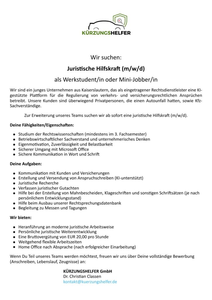 - gute Grundkenntnisse zu verbraucherrechtlichen Themen (ggf. durch Berührungspunkte im
